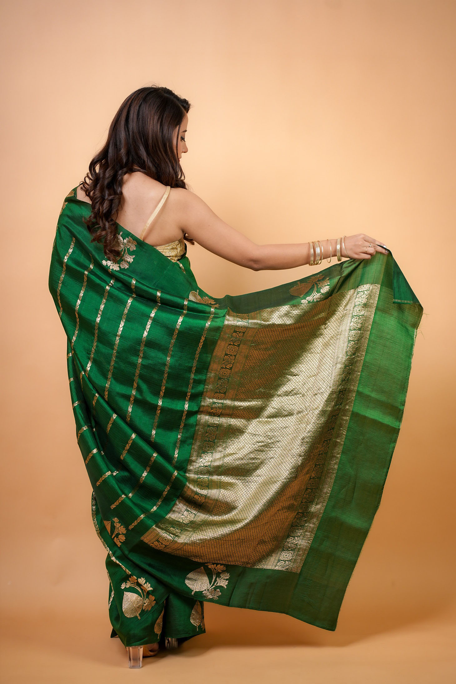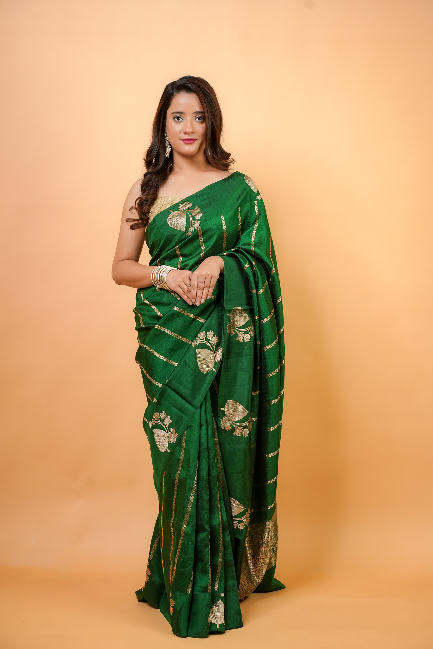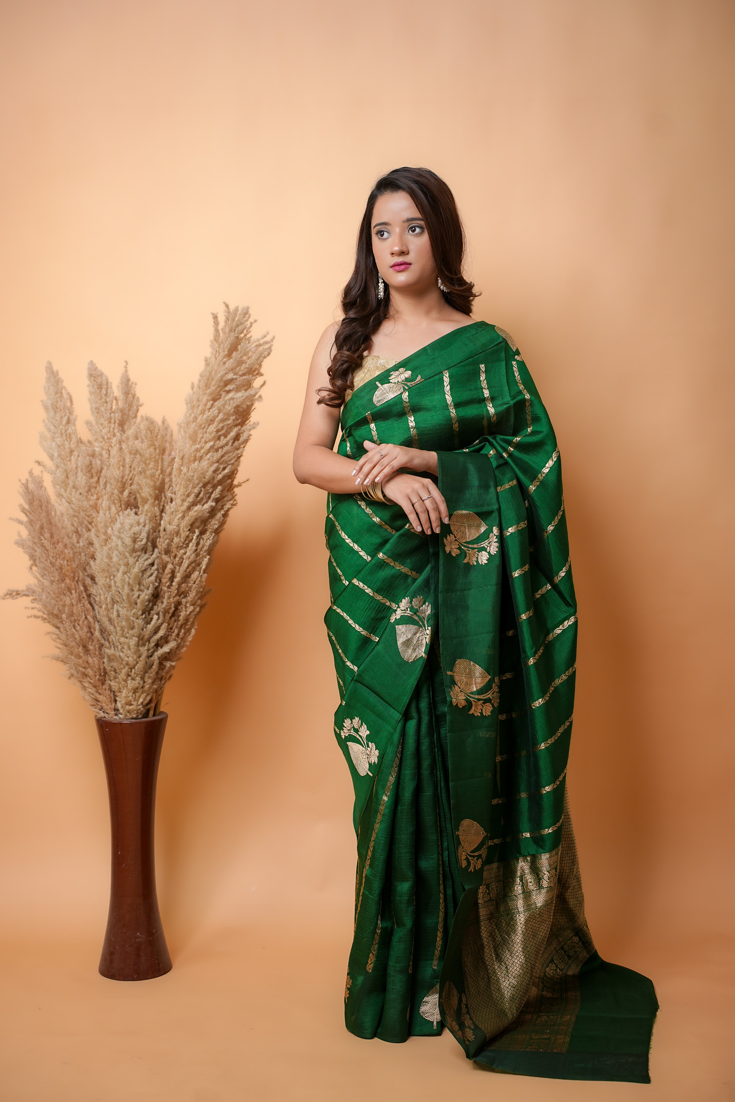 A handwoven masterpiece, this Bottle Green Banarasi saree is a celebration of luxurious tradition. The airy  Banarasi fabric is meticulously adorned with intricate all-over bootis, creating a delicate, shimmering pattern that dances with light. The look is complete with a richly woven heavy pallu and a matching self-blouse, making it an exquisite choice for any special occasion that demands elegance and grace.