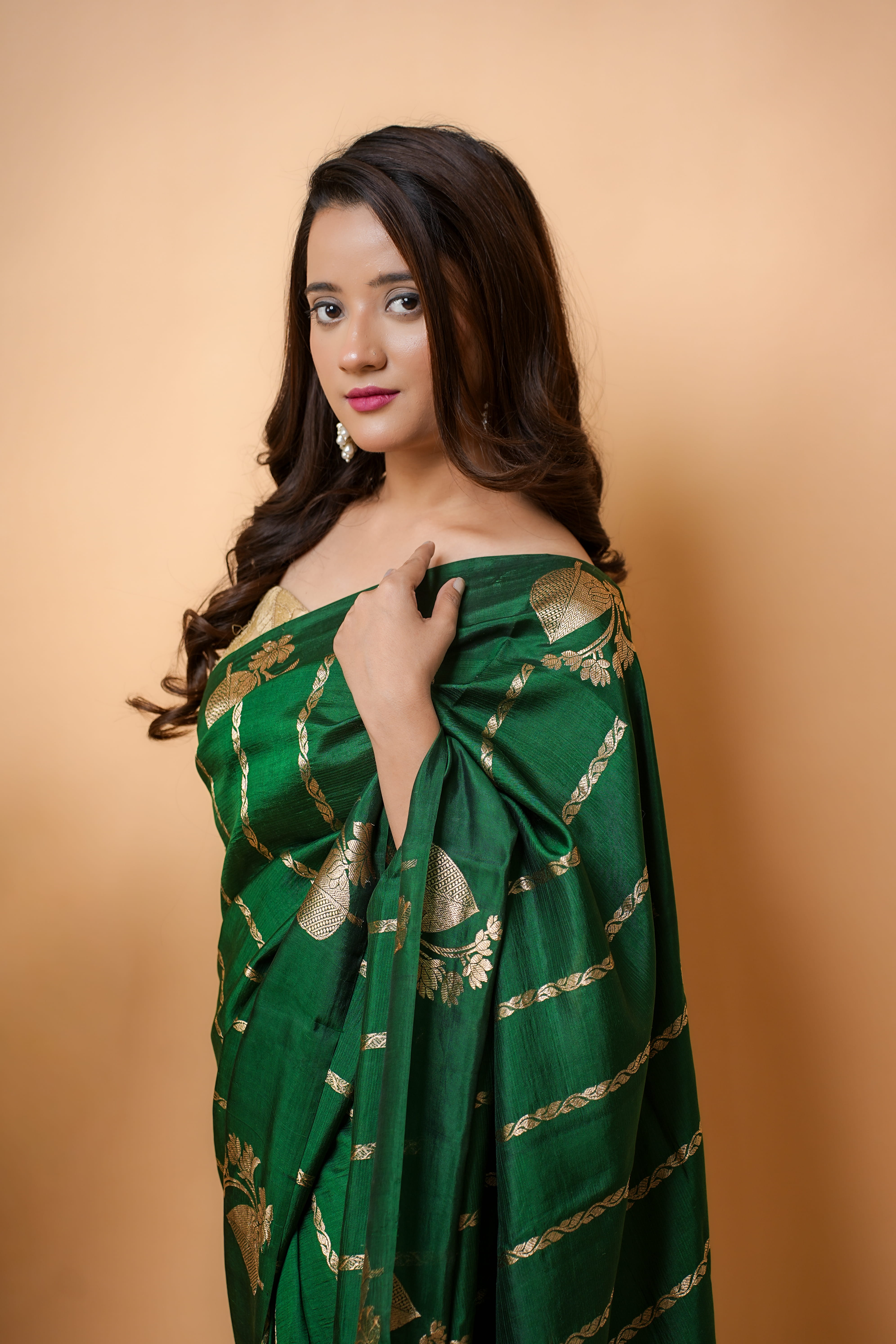 Boota: Small, repeated motifs (often floral or paisley) woven across the saree body; when done in zari (metallic thread) it adds shimmer and traditional richness.