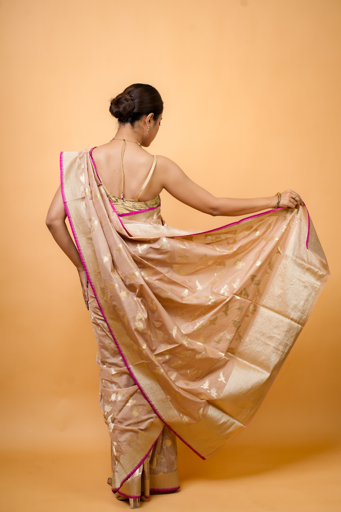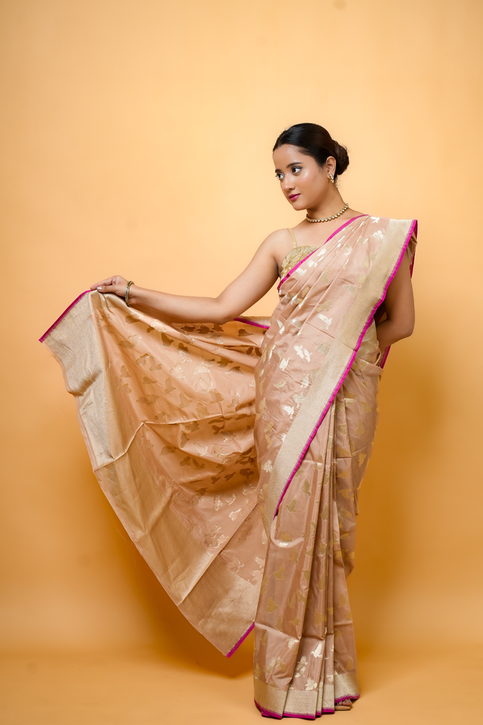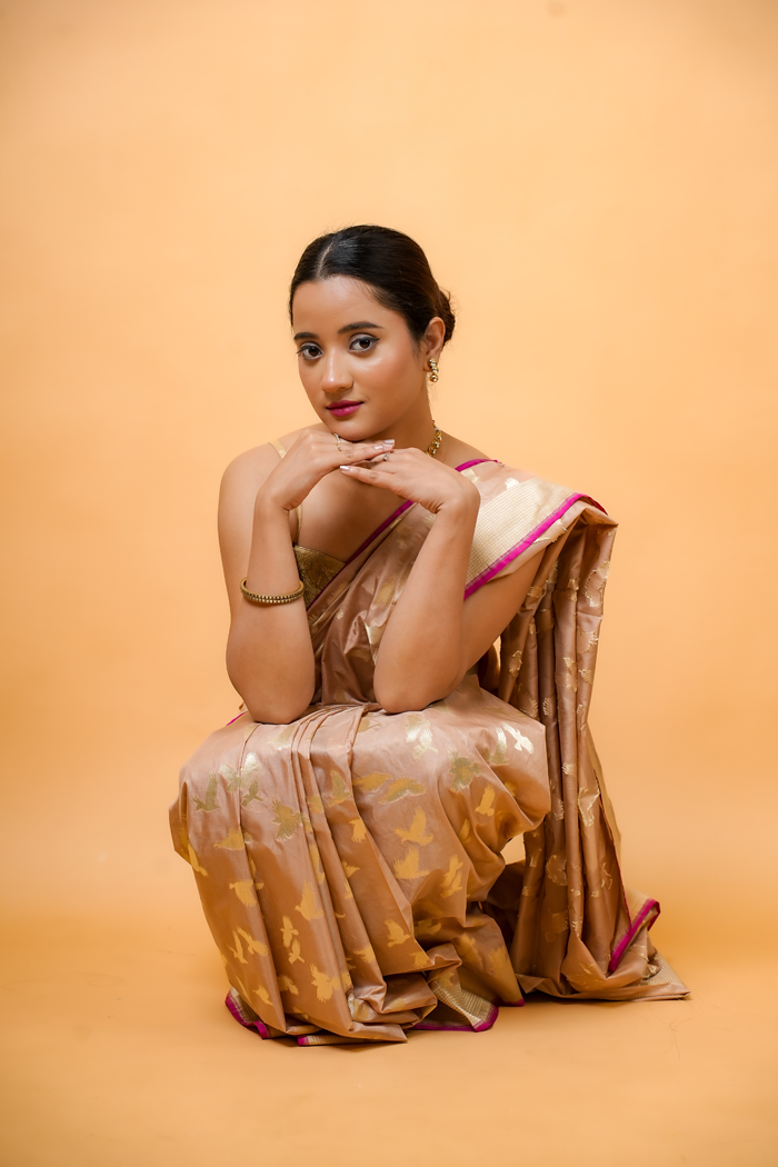 Fawn Elegance Bird Motif Handwoven Banarasi Saree